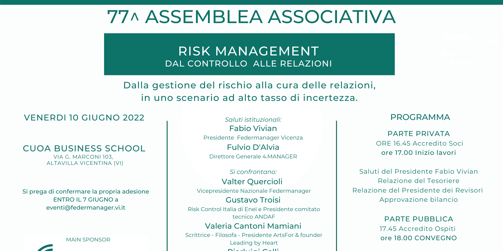 È con grande piacere che ti invito alla 77^ assemblea territoriale di Federmanager Vicenza, che finalmente torneremo a fare in presenza.