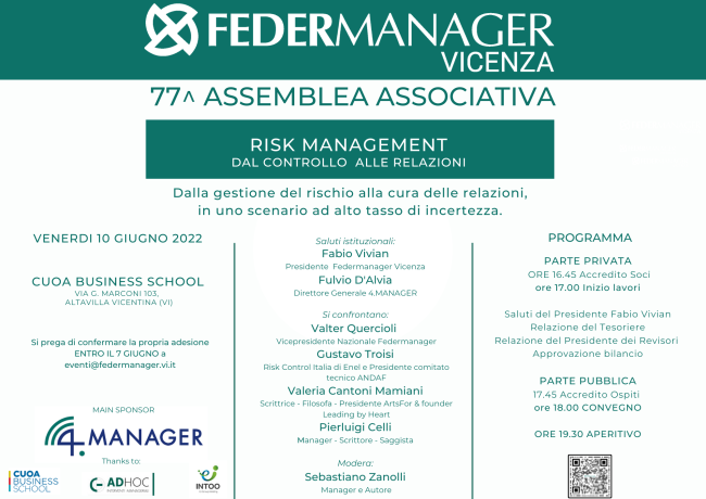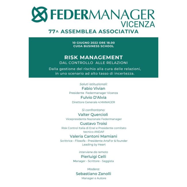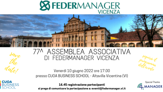 OGGI ALLE 18,00 IL CONVEGNO AL CUOA BUSINESS SCHOOL, IN OCCASIONE DELLA 77^ ASSEMBLEA ASSOCIATIVA DI FEDERMANAGER VICENZA