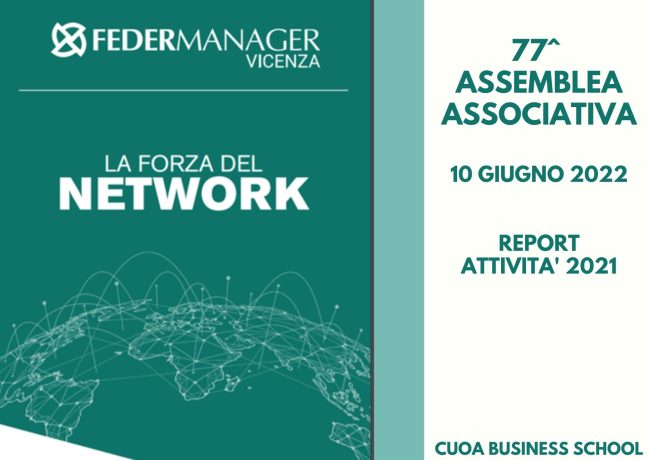 È con grande piacere che ti invito alla 77^ assemblea territoriale di Federmanager Vicenza, che finalmente torneremo a fare in presenza. Come di consueto, riserveremo la prima parte dell’incontro agli Iscritti, ai quali presenteremo le attività svolte dalla nostra territoriale e dai gruppi di lavoro nel 2021. Presenteremo il bilancio al 31/12/2021 e procederemo…