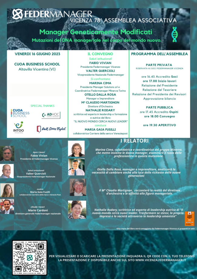 Il nuovo manager come un direttore d’orchestra che lavora con la squadra. “Manager geneticamente modificati” è il tema dell’assemblea 2023 di Federmanager Vicenza, che si terrà venerdì 16 maggio presso CUOA Business School di Altavilla Vicentina. Un’importante occasione per analizzare una professione sempre in evoluzione, come sottolinea il presidente di Federmanager Vicenza Fabio Vivian: «In tempi di alta volatilità come…