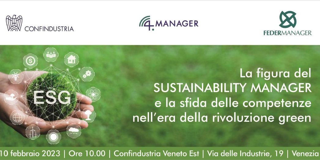 Il prossimo 10 febbraio 2023, alle ore 10:00, l’evento “La figura del SUSTAINABILITY MANAGER e la sfida delle competenze nell’era della rivoluzione green“ che si terrà a Venezia presso Confindustria Venezia, via delle Industrie 19 organizzato da 4.Manager, Confindustria e Federmanager in collaborazione con SFC e Confindustria Venezia.