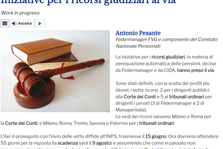 Di seguito l’articolo di Antonio Pesante, Federmanager FVG e componente del Comitato Nazionale Pensionati Iniziative per i ricorsi giudiziari al via – FM Triveneto – Dirigenti Senior Facebook Twitter…