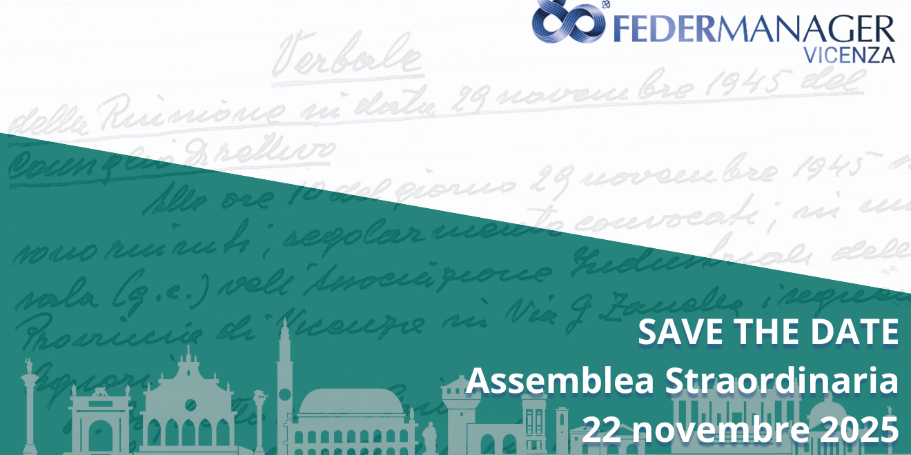 ti invitiamo a segnare in agenda la data del 22 novembre 2025 per partecipare all’Assemblea Straordinaria di Federmanager Vicenza, convocata per l’esame e l’approvazione delle modifiche statutarie.